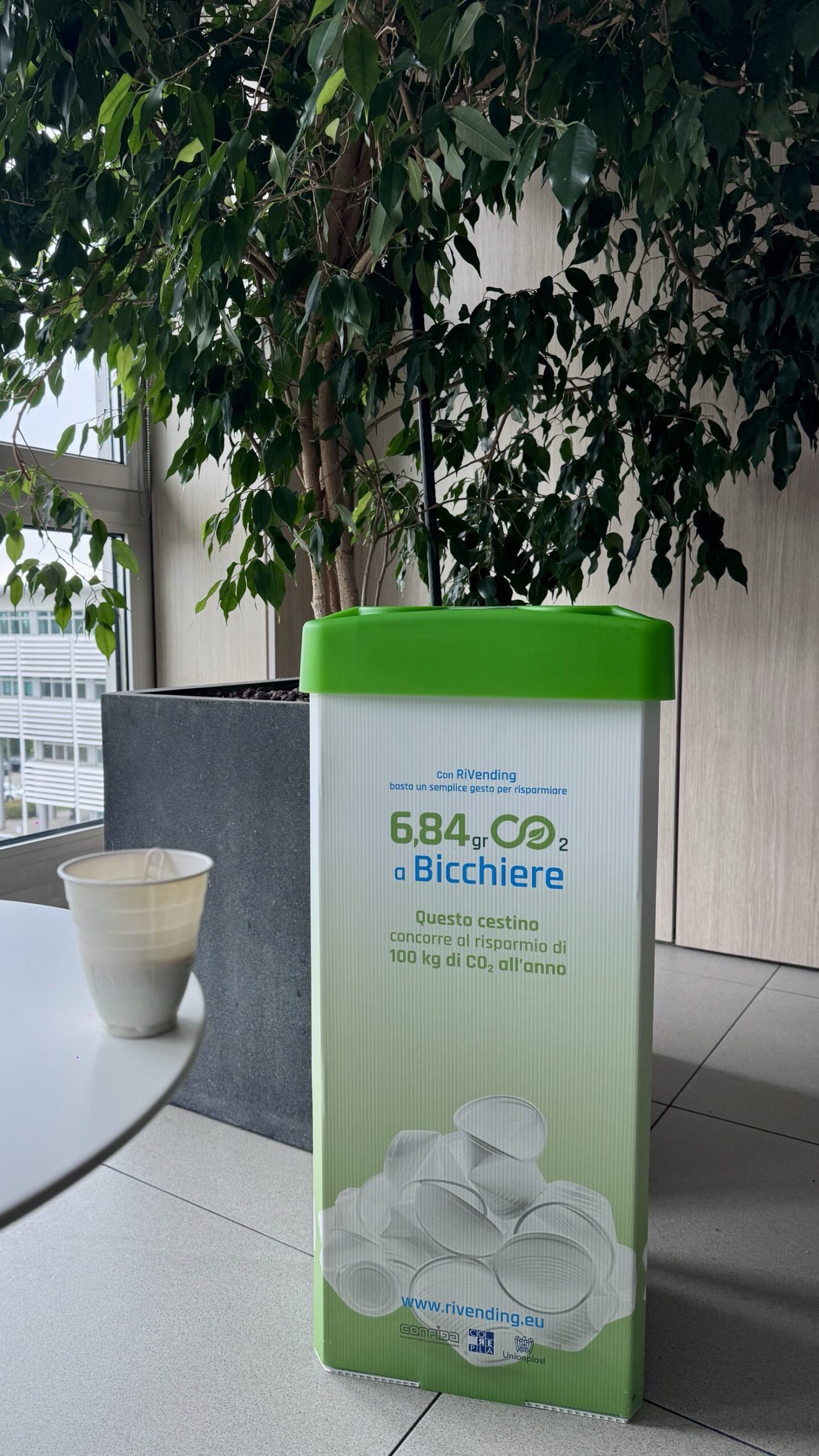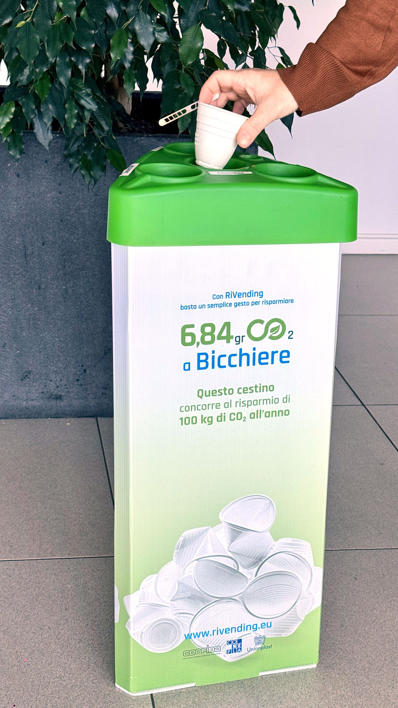 I distributori automatici presso la nostra sede principale al Business Park erogano bicchieri realizzati con PS riciclato, che vanno gettati in appositi contenitori dedicati, che consentono una raccolta differenziata monomateriale semplice ed efficace, con una grande riduzione del volume dei rifiuti raccolti.